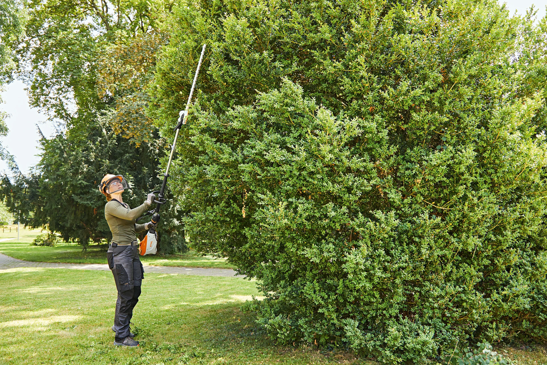 The most powerful cordless long-reach hedge trimmer in the STIHL range for professional use in noise sensitive areas. For cutting shrubs and bushes as well as plants near the ground, and the whole spectrum from trimming to pruning. The cutter bar can be adjusted through 145° without the use of tools for head-height, side, and ground-level cutting. Double-sided cutting blade for a clean cutting pattern. Intuitive control handle with an LED display.